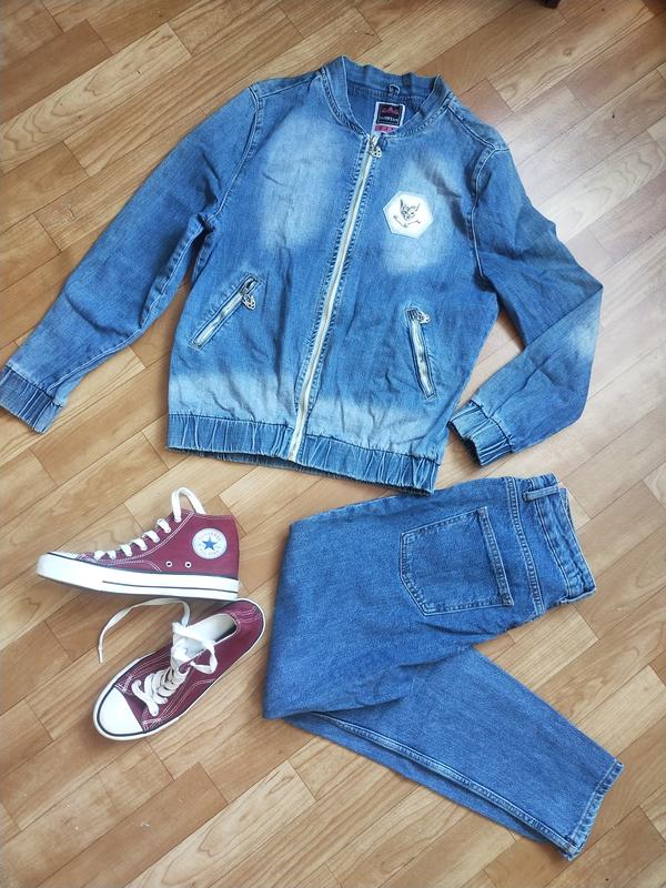 Бомбер з фабричними потертостями та висвітленням тканини. Тонкий коттон з домішками константу, тому тканини тягнеться. В манжетах і поясі є широка резинка. Спереду функціональні кишені на застібці. Заміри: плечі 41 (півобхват) ПОГ 52 ПОТ 40 довжина по спинці 61 довжина рукава 60 На бірці розмір ХЛ, фактично йде на Л.