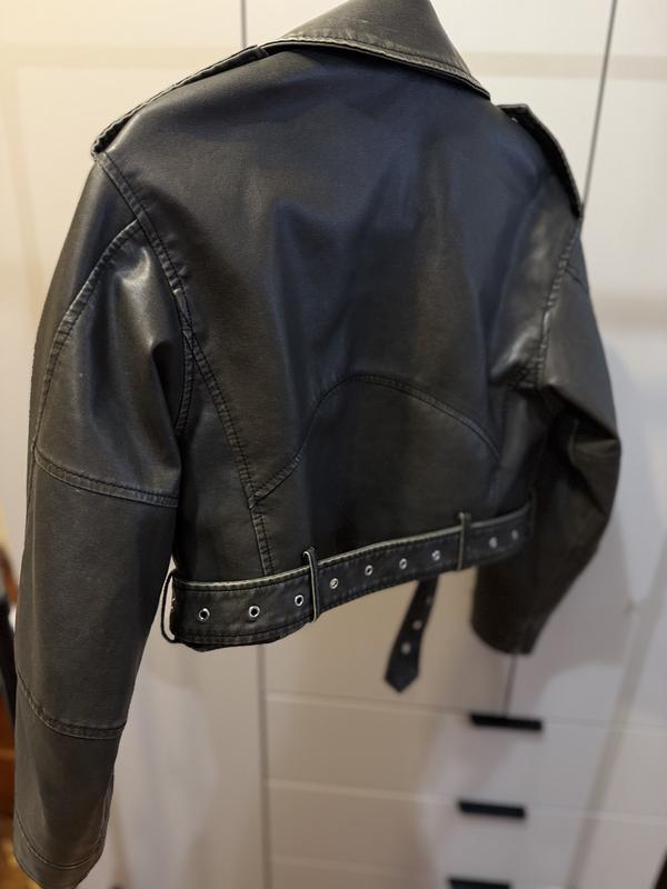 Бренд: House. • Розмір: на бірці XS/S (завдяки вільному крою та спущеній лінії плеча підійде на обидва розміри). • Колір: Графітово-чорний із ефектом вінтажного висвітлення на швах. • Фасон: Укорочений (кроп), ідеально підкреслює талію, особливо з джинсами на високій посадці. • Деталі: Широкий ремінь із люверсами по низу, погони на плечах, масивні металеві блискавки.