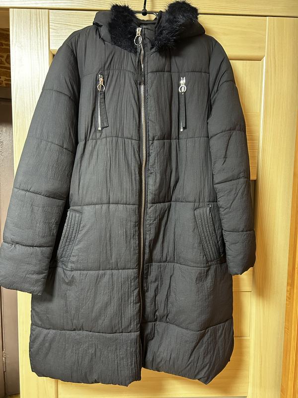 Зимняя женская куртка с карманами и капюшоном,внутри него мех, внутри подкладка-спина утеплена мехом, ткань жатка не промокает,все замеры на фото в спокойном состоянии ,цвет темно синий,длина 103 см