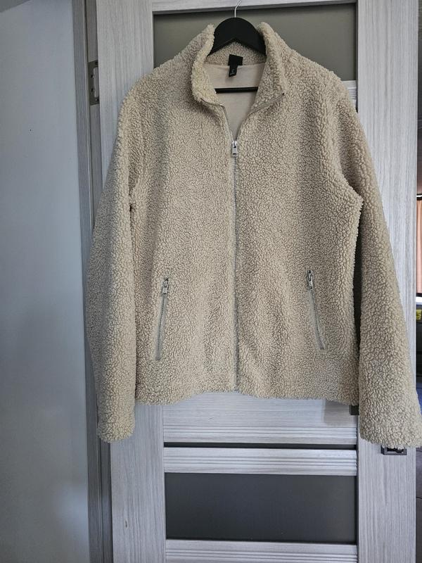 Це флісова куртка або зіпка від бренду H&M. Завдяки характерній текстурі матеріалу, таку річ часто називають «тедді» (teddy), «шерпа» (sherpa) або курткою-«баранцем». Матеріал: Виготовлена з м'якого штучного хутра (плюшу), що імітує овечу вовну. Склад 100% складається з поліестеру, а підкладка містити бавовну. Високий комір-стійка для захисту від вітру. Застібається на блискавку по всій довжині. Має дві бічні кишені, які також закриваються на блискавки. Колір: Світло-бежевий, кремовий або молочний. Це універсальна річ для демісезону (весна/осінь). Її можна носити як легку самостійну куртку або як проміжний теплий шар під пальто чи пуховик у холодну пору року. Розмір по бірці XL але орінтуйтесь по замірам : Об/груди 120 , об/талія 116 , об/стегна 124 , довжина 72 , рукав 85.