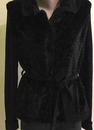 Стан ідеальний Чорного кольору Верх штучне хутро ( полірований) Хутро супер м'який Рукава в'язані На підкладці Застібається на гудзики ( є одна запасна) Є дві кишені Зав'язується на пояс Виміри Плечі 38 Рукав 68 ПоГ 50 Піт 48 Низ по56 Довжина 63