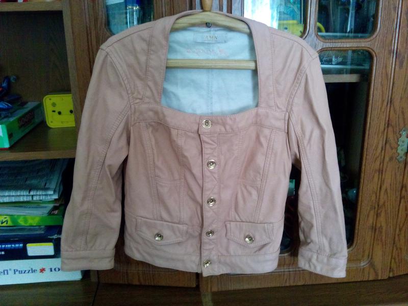 Куртка кольору пудри. Довжина без коміра 44 см , з коміром 47см. Плечі 39див. Під пахвами 41см. Довжина рукава від плечя 43см. Попереду дві кишені-обманки. Застібка на золотисті гудзички , на рукавах-застібка на одну золотисту гудзик. Куртка з шкір заст. Торг. Доречний!