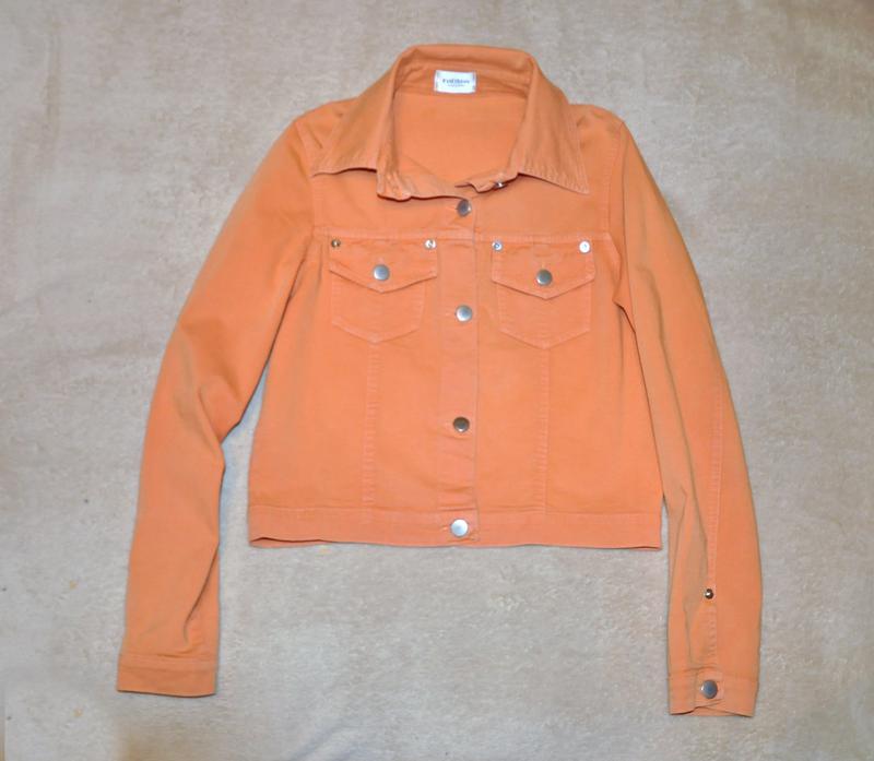 Летняя оранжевая джинсовая куртка до талии. Длина рукава - 62 см, пог - 45 см, пот - 41 см, плечи - 35 см.