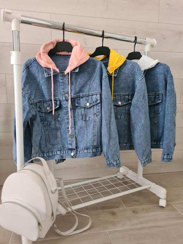Джинсовці з капюшоном (Фабричний Китай) модель вільна капюшон знімних тканина джинс коттон (не тягнеться) напис вишивка розмір універсальний 42/46 довжина 56 см рукав від шва 49 см бюст 98 см колір білий.рожевий.жовтий