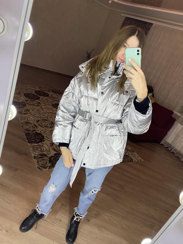блискуча куртка під поясок, рукава на манжетах, високий комірець, капюшон☝🏼☺️ срібна