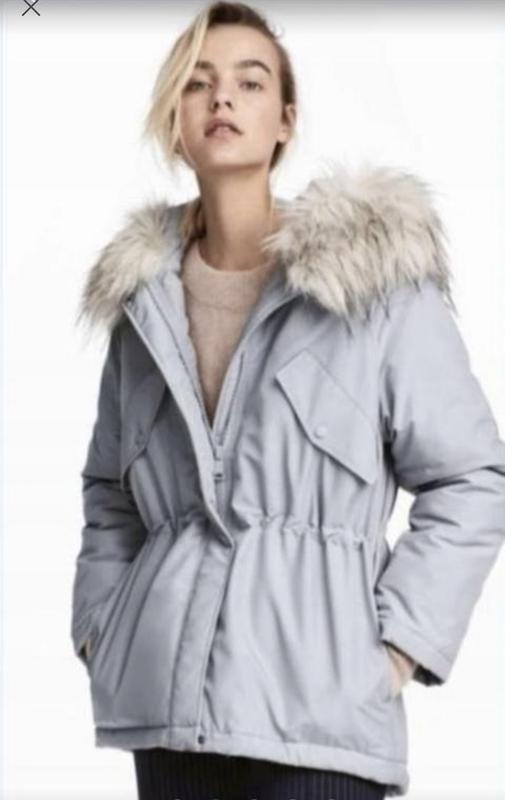 Стильна куртка з капюшоном від H&M. Світло-сірого кольору з голубим відтінком. Тканина щільна вологонепроникна. Хутро з капюшону не знімається. Оверсайз. Стан нової речі.