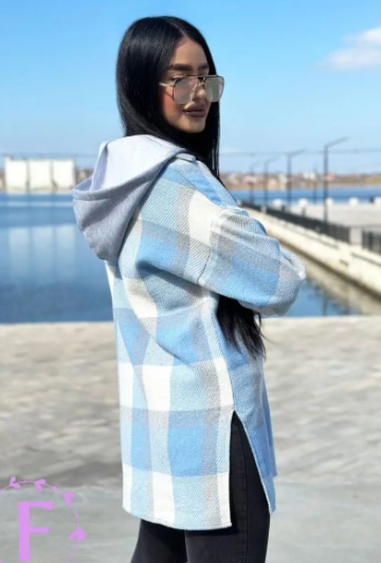 Рубашка в клетку оверсайз Норма, Батал Теплая рубашка в клетку с капюшоном – обязательный элемент женского гардероба в осенне-весенний период. Это незаменимая вещь в арсенале современной модницы! Такая рубашка с легкостью заменит верхнюю одежду, защитит от ветра и холода, а также удачно впишется в любой обычный образ. - свободный фасон оверсайз; - длинные рукава с манжетами; - на груди расположены большие карманы с клапанами; - по бокам имеются небольшие разрезы; – капюшон отстегивается. Изготовлена теплая женская рубашка в клетку из плотной ткани, в составе которой есть шерсть. Материал имеет мягкую ворсистую текстуру, поэтому приятен на ощупь и создает ощущение уюта. Капюшон из трикотажа тринитка (на флисе) и пристегивается с помощью пуговиц. Сезон: Осень/зима Длина от плеча: 77-78 см Длина рукава от горловины: 73-74 см. Материал: Шерсть, капюшон тринитка Размер норма 42-44 46-48 -965 грн Размер батал 50-52 - 1125 грн Цвета: Черный с белым , Голубой с серым