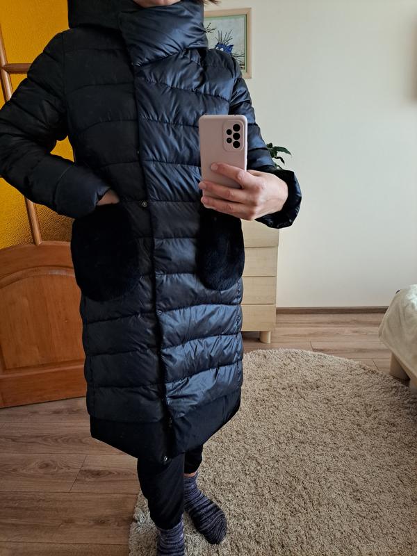 Пальто на синтепоні ,б/в, розмір вказаний XL але підійде на M-L, ріст моделі 175см, надзвичайно тепле в хорошому стані , недоліків немає. заміри на фото, хутро на кішеньках відстьобується .