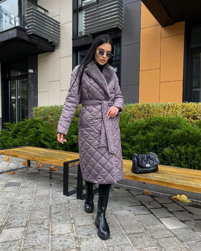 Стьобане пальто з відкладним коміром на кнопках з поясом