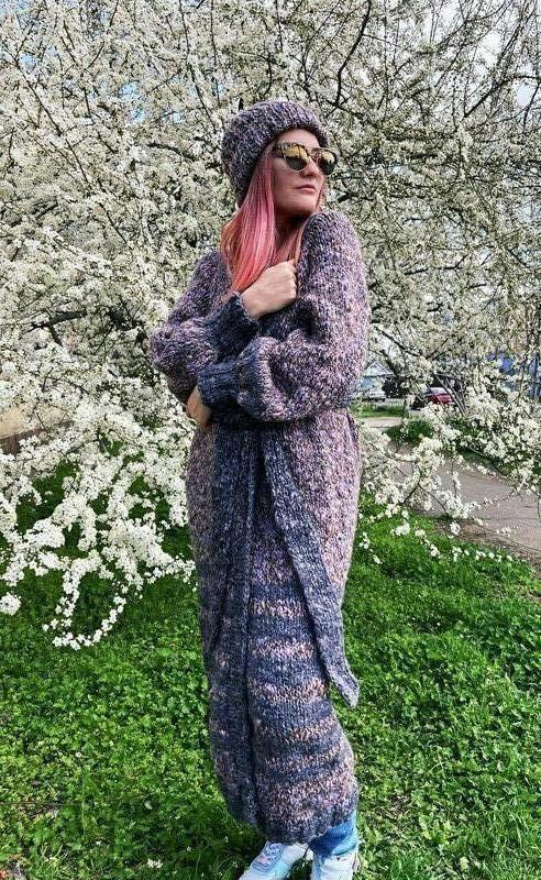 Стильне,тепле,затишне,м'яке(абсолютно відсутня колючість) пальто-халат! Обійме,сховає,огорне,зігріє. Неймовірної краси пряжа з ефектом фламме. Характерні особливості - в пряжі присутні відрізки різної товщини з чергуванням різних колірних відтінків. Тому у зв'язаному трикотажному полотні виразно помітні зони з товстими і тонкими нитками і ефектний перехід контрастних кольорів. До речі, в цьому сезоні пряжі Фламе, вірніше вироби з неї, входить в моду. Вільний крій,розмір оверсайз, пояс і шапка в гумку так і віє 70-ми роками. Самодостатній комплект! Вам не треба думати що ж надіти щоб виглядати стильно. Ручна робота. Більше фото за запитом. Додаткові характеристики: Колір: Коричневий Колір: Рожевий Колір: Сірий Матеріал: Трикотаж Матеріал: Вовна Колір: Коричневий Колір: Мокко Колір: Рожевий Колір: Сірий Розмір жіночого одягу: 42/44 Розмір жіночого одягу: 48 - 50 Вид пальто: Довге Сезон: Весна / Осінь Довжина: Довге