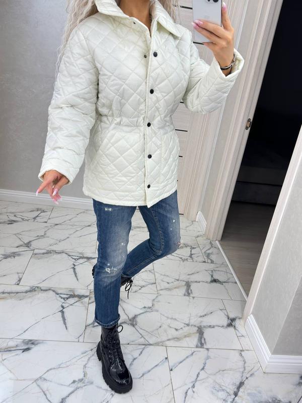 Куртка стеганая демисезонная #38 Фасон прямой свободный, акцент по талии можно выделить ( внутри резинка на кулисе регулируется) Размеры: XS-S(42-44), M-L(46-48), XL(50-52) Цвет: чёрный, белый, бежевый Ткань плащовка лаке стеганая Утеплитель силикон плотность 100 (пар) ЗАМЕРЫ по верху изделия XS-S (42-44): Длина изделия - 74 см Длина рукава -58 см, длина плеча - 14,5 см Обхват груди - 110 см , талия - 104 см, бедра - 110 см M-L (46-48): Длина изделия - 75 см Длина рукава -59 см, длина плеча - 15,5 см Обхват груди - 116 см , талия - 112 см, бедра - 116 см XL(50-52): Длина изделия - 76 см Длина рукава -59 см, длина плеча - 16,5 см Обхват груди - 120 см , талия - 116 см, бедра - 120 см