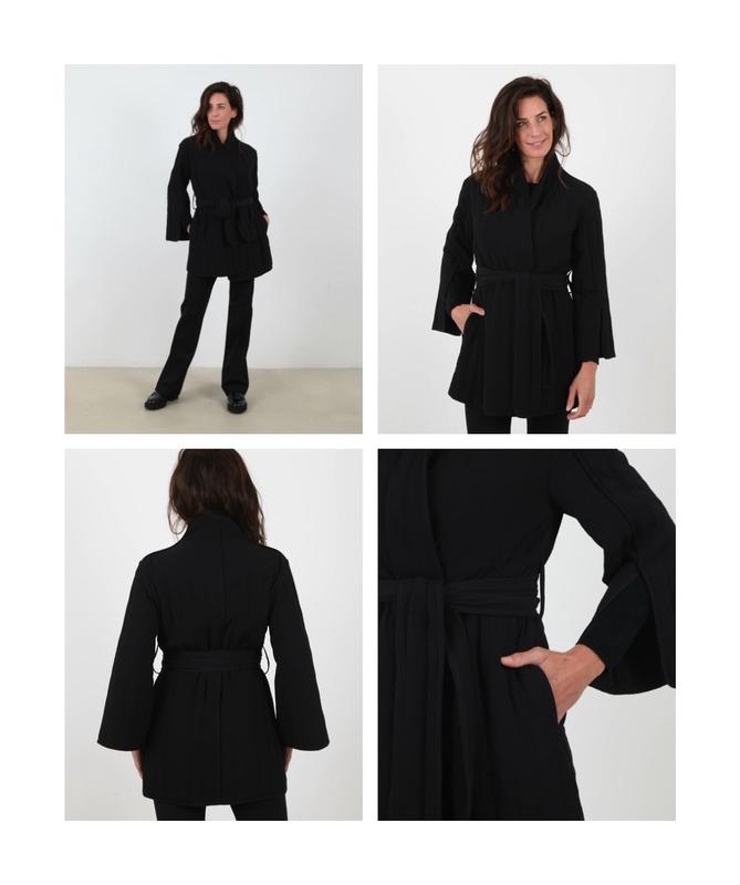 Куртка стьобана без ґудзиків, на затин, фіксується широким поясом (куртка- кімоно) Розмір виробника М Заміри: ширина спинки - 55 см, ширина полочки - 37 см, довжина - 86 см, рукав від плеча - 55 см, плечі - 48 см Дуже стильна і статусна річ. Краще сяде на невисокий зріст. Всередині має тонкий синтетичний утеплювач Підійде на сезон весна-осінь Має бокові кишені та розрізи на кінці рукава Склад тканини: віскоза 2 різних видів Що зовні, що всередині куртка має одинаковий вигляд (фото 8) Фактуру тканини можна побачити при збільшенні фото Колір чорний насичений До тканини не налипає різне сміття (пух тварин, волосся, тощо), що дуже важливо для чорної речі Нова, без паперової бірки Жодних нюансів чи недоліків Цінова політика бренду (фото 10)