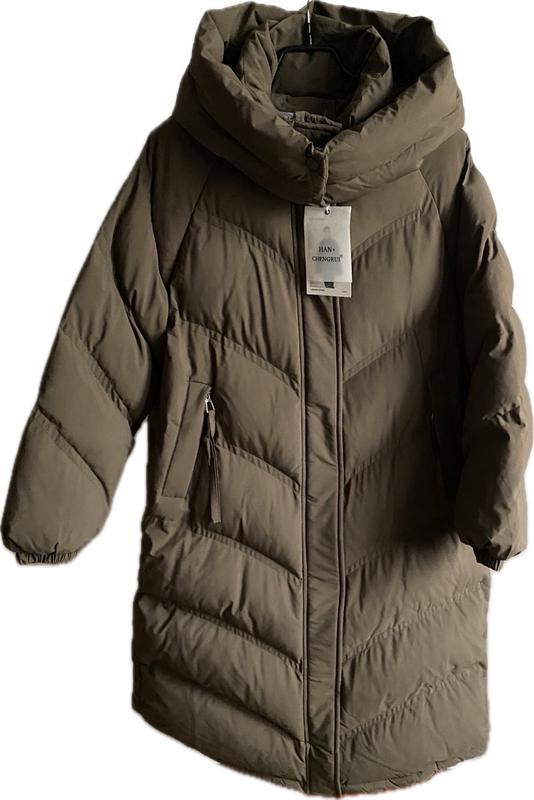 Подовжена жіноча куртка-пуховик HAN CHENGRUI (Нова) Стильне довге пальто-пуховик у глибокому оливковому (хакі) кольорі. Модель має сучасний об'ємний силует, що забезпечує тепло та комфорт у зимовий період. * Колір: Темна олива / хакі. * Дизайн: Трендова V-подібна стібка, що додає виробу фактурності. * Особливості: * Високий комір-стійка та глибокий капюшон для максимального захисту від вітру. * Застібається на блискавку, приховану клапаном на кнопках. * Зручні бічні кишені на блискавках. * Стан: Нова з фірмовими етикетками. Якісна та затишна модель, ідеальна для щоденних прогулянок у морозну погоду.