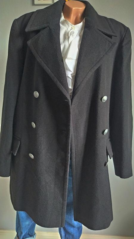 Двобортне чорне напівпальто з однотонної тканини у стилі smart casual, прямий крій, з боків кишені з клапанами, на чорній підкладці, склад тканини - мікс змішаних волокон(дослівний переклад), розмір на бірці європейський 42, сток, стан супер, без слідів шкарпетки, заміри: довжина - 77 см, плечі - 46 см, ПОГ - 56-58 см, довжина рукава - 60 см