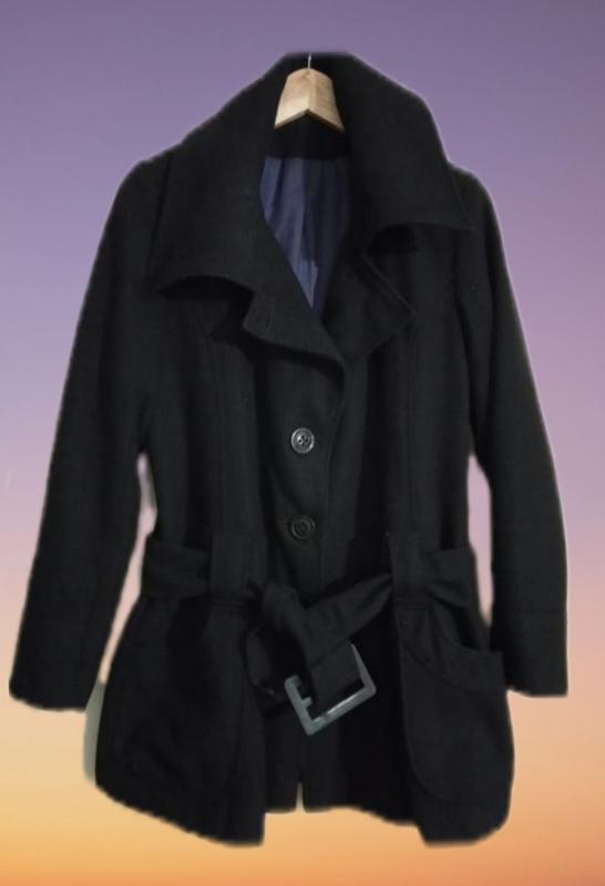 - Стильне, брендове, демісезонне пальто, півпальто під пояс - бренд New look. - Колір чорний. - Розмір укр.46-48 - Гудзики можна перешити на будь-який з зазначених розмірів. - З двома накладними кишенями Заміри: довжина 82 см довжина рукава 62 см ПОГ 50 см Склад : 50% вовни