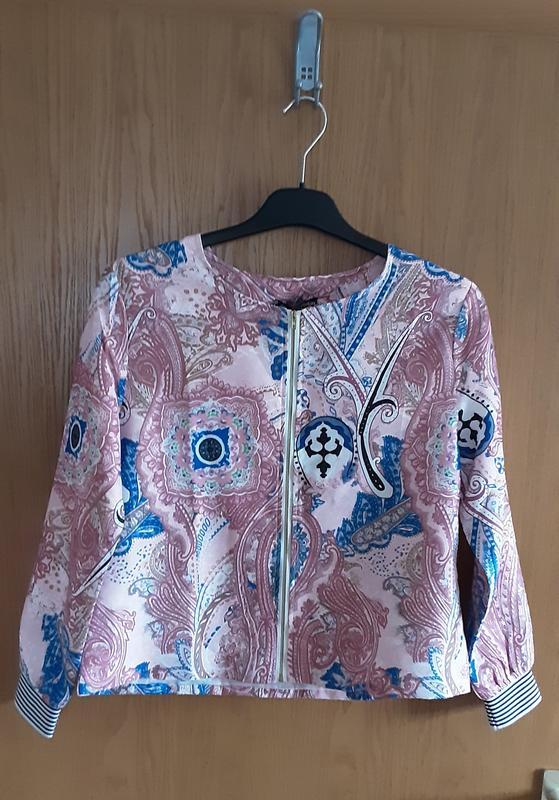 Жіночий жакет,піджак легенький на підкладці.Luxuries rese Розмір вказаний XL (підходе на M (44 ) Склад: 65 % котон, 35 % поліэстер, На блискавці,низ рукава на резинці. Блискавка 45,5 см , довжина рукава від плеча 55 см , висота резинки 4,5 см , довжина по спині 53 см ,ширинампід пахвами 49 см Колір рожевий,візерунки.