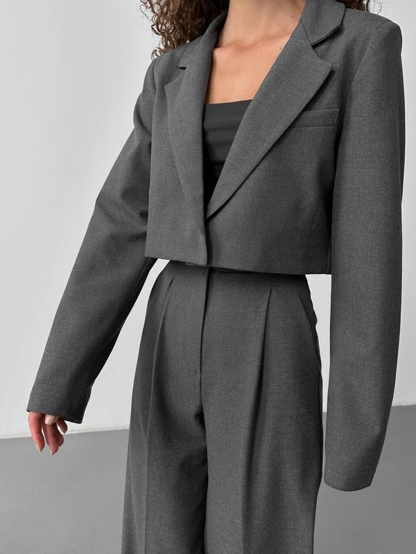 Укороченный пиджак темно-серого цвета. Модель с длинными рукавами и нагрудным карманом. Застегивается на скрытую изнутри пуговицу. Состав: 55% вискоза, 42% полиэстер, 3% элаcтан. Собственное производство.