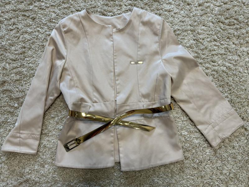 Піджак класичний, бежевого кольору. В комплекті йде пояс золотого кольору. Піджак як новий, вдягався 2 рази. ОТ 39см, довжина 55см, підійде на розмір с-м