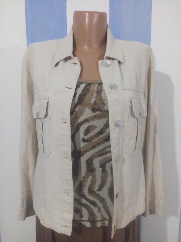 Якісний льон,фасон,як у джинсової куртки.Розмір С- М,плечі-43, пог- 48, поб- 48, пот-43, рукав- 53-54( плече трохи спущене), довжина-56