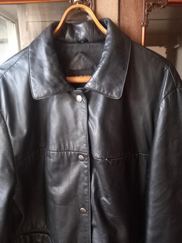 Кожаний піджак з добротної кожі,мягка та в хорошому стані.Піджак на заклепках,має 2 розрізи збоку.Пог-65см.Пот-65см.Довжина-75см.