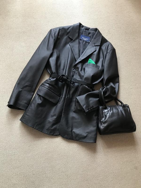 Фирменный кожаный пиджак/жакет на пышную красотку. Можно и на 10-12 размер, но будет очень овер оверсайс. Не носился вообще. В подарок платочек из шелка натурального( в кармашке) и пояс актуальный на спортзастежке. Заявлен размер 26( не знаю какой это, потому как застежка на мужскую сторону) но рукава не очень длинные для такого размера( если рассматривать как мужской). Ориент по замерам: Длина от плеча 82см Пог 62-63см Пот 57см Поб 61см Рукав 62см Реально пиджак для модниц! ( сумка тоже в продаже на странице моей есть)