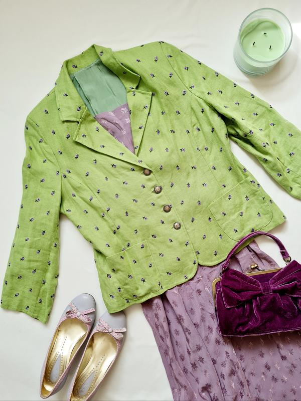 💐річ для весняного настрою 💐жакет ніжно-салатового кольору з вишитими квіточками 💐стан нової речі 💐бірка зі складом відсутня, тканина тактильно льон, підклад ацетатний є підплічники пог 52 пот 49 рукав 51 довжина спереду 60 по плечам спереду 39