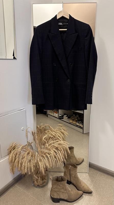 Неймовірний, вовняний оверсайз піджак від бренду ZARA. Насиченого синьо-чорного кольору в клітинку. На жаль, камера не передає. Прекрасно тримає форму. Дуже щільний. З підплічниками. На підкладі. На параметри xs-s-m: Ширина 48см Довжина 70см Довжина рукава від горловини 70см Ширина плечей 37-38см У складі є вовна. По бірці розмір m. Орієнтуйтесь на мої параметри 86-65-94. Зріст 170см. Сидить бездоганно!