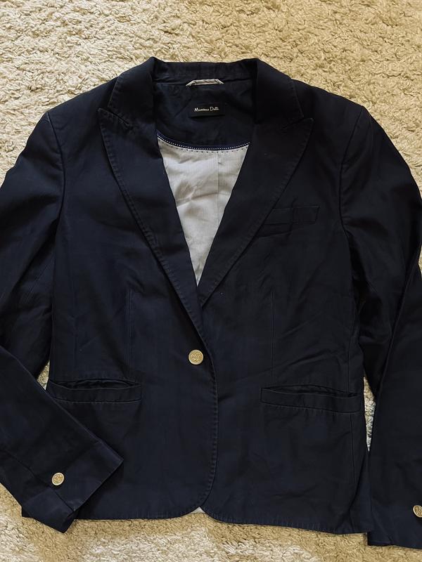 Оригинальный пиджак знаменитый бренд Massimo Dutti, темно- синего цвета, на весну- лето, состав 57./‘ cotton, 43./‘ полиэстер, фурнитура брендированная, состояние идеальное, размер указан 42/32, подходит на S,M- см замеры