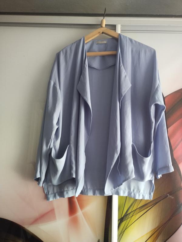 Стильний лiтнiй пiджак нiжного голубого кольору. Плече приспущене, рукав завужений. Завдяки вiльному крою i завуженому рукаву тканина вiльно спадае. Виглядае дуже стильно.