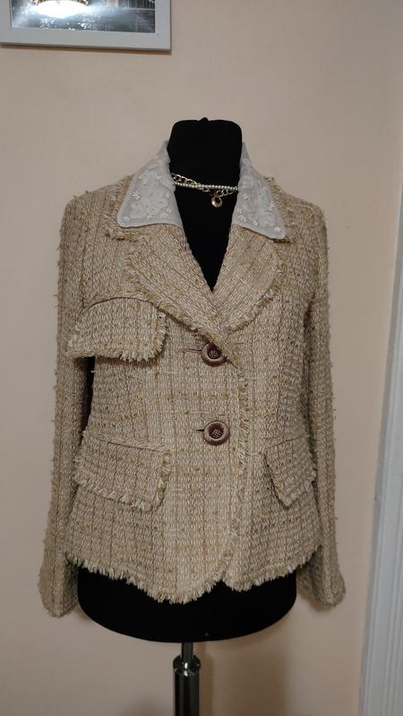 піджак жакет жіночий стильний тренд твідовий Заміри: довжина 53см, рукав 57см, півобхват біцепс 15см, плечі 36см, ПОГ 48см, ПОТ 44см, ПОБ 52см.
