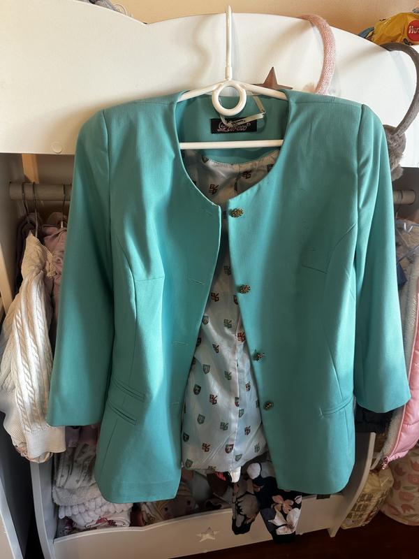 Піджак жіночий Колір бірюзовий Розмір 36 Є дефект , декілька затяжок з лівої сторони піджака зверху , на фото видно