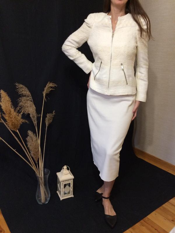 Колір молочний, бірка зі складом зрізана, по вигляду тканина змішана, структура букле. Вдягнений на дівчину зріст 167 см, фігура 92х74х98 см. Вказаний на бірці розмір М, але йде розмір менше