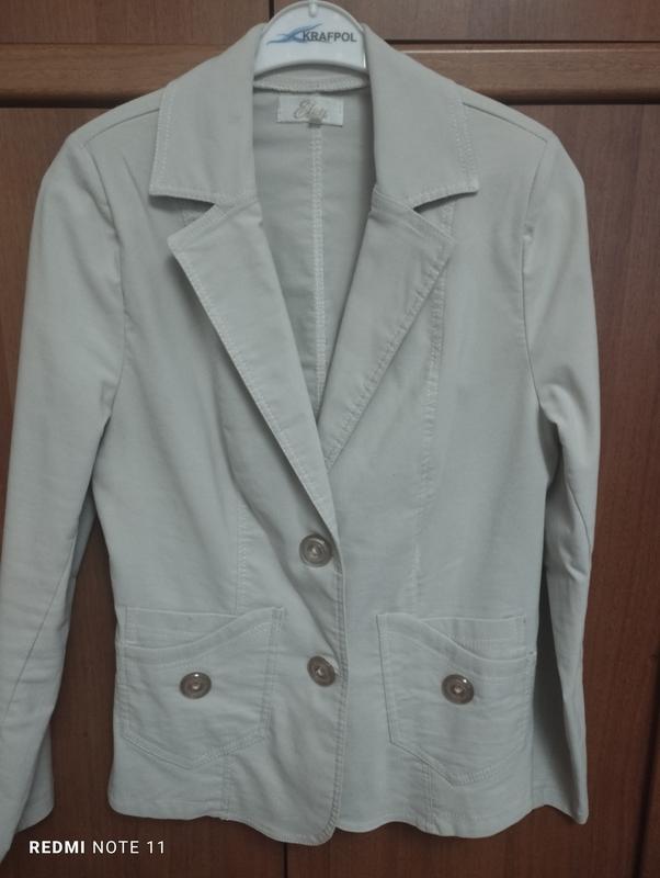 Піджак навий, одягався всього один раз.Плечі 33 см,груди 44 см,бедра 47 см, рукав 61 см, довжина 61 см.Тканина стрейчева, трохи тягнеться.