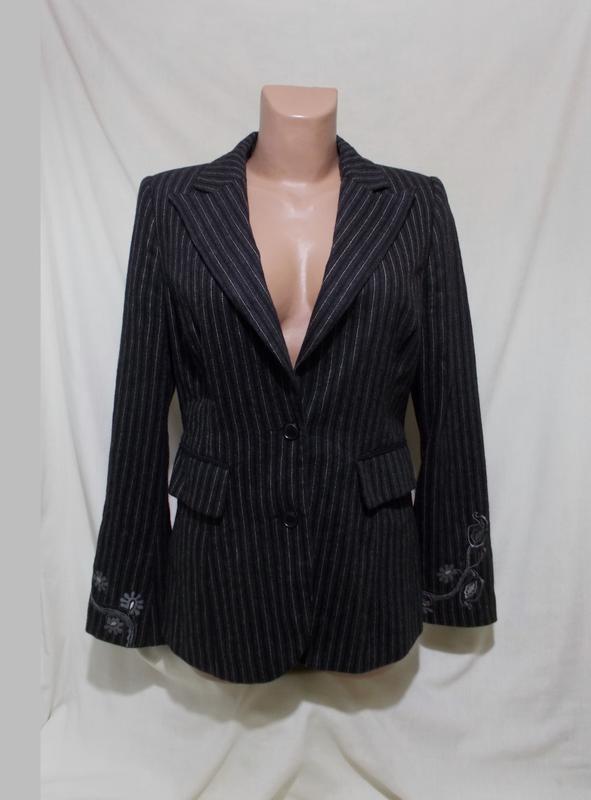 Жакет в ідеальному стані. Красиве забарвлення (сіро-чорні смуги з декоративними жовтуватими строчками), на рукавах красива квіткова вишивка сірими та сріблястими нитками, приталений фасон, дві повноцінні кишені, тканина середньої щільності, злегка пухнаста, м'яка, на підкладці. На оф сайті подібний, але без вишивки коштує 190 Склад: 50% вовна, 25% віскоза, 25% поліамід підкладка: 100% ацетат (ск. шовк). Мерки (на бирці UK12): плечі 38 см НОГ 48 см ПОТ 41 см низ 48 см рукав 63 см довжина 67 см Данський бренд Part Two був заснований у Копенгагені 1986 року та дуже швидко — за п'ять років став дуже популярним у світі моди. Виробляє одяг високої якості для справжніх жінок, що живуть справжнім життям. Бренд вирізняє щирість, позачасовість і відчуття природної жіночності. Він створює моду для жінки, яка хоче мати чудовий вигляд, але водночас почуватися комфортно, насолоджуючись справжніми моментами життя. Всі колекції демонструють надійну якість, виражену через увагу до чудового дизайну, зручної посадки, багатства тканин і чудової майстерності.