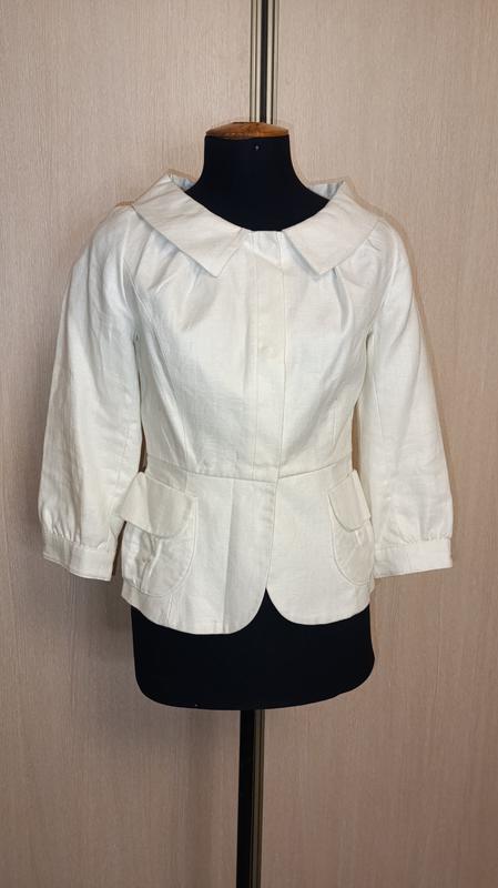 піджак швидше за все новий силует приталений. рукавчик зі складочками. гарний комірець під яким зборочки. бо бокам пара карманов. застібається на кнопки. кнопки обтягнуті тканиною. від талії красива баска. довжина 55 см довжина рукава 48 см плечі 36 см НОГ 45 см ПОТ 36см