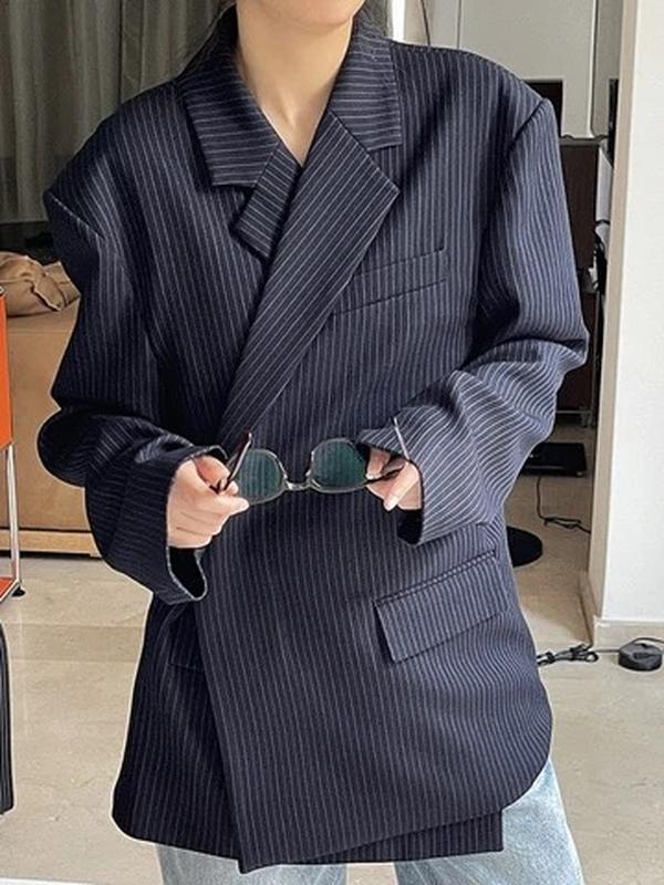 Темно-синий пиджак в полоску оверсайз, идеально смотрится с различными брюками , джинсами и юбками макси и мини, подойдет на S-M