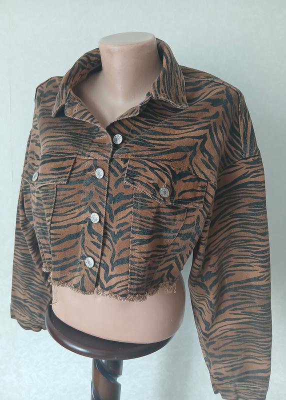 Укорочена джинсовка, розмір S-M. стильний принт. Довжина 40 см, рукав від ворота 69 см, ПОГ 53 см, півобхват низу 50 см.