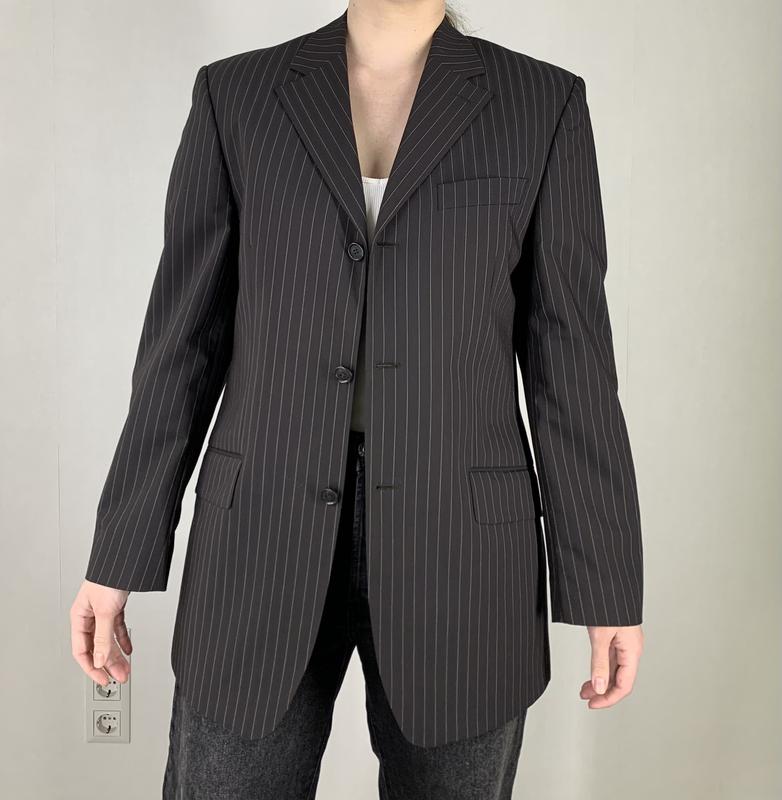 Піджак чорно-коричневого кольору у смужку, з чоловічого плеча У складі 31% віскоза, 66% поліестер Довжина 77 см, ширина плеч 45 см, довжина рукава 63 см, напівобхват грудей 50 см Стан ідеал Вдягнуто на розмір Л, зріст 167