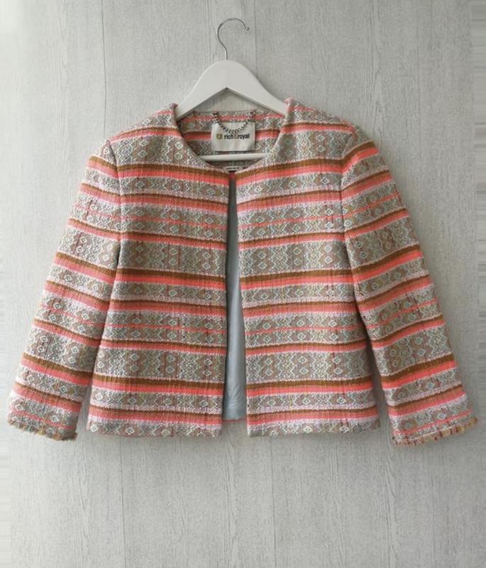 Красивый цветной жакет.Ткань из натурального хлопка.Замеры по желанию. Италия.Размер xs,s Плечі від шва до шва 40 см. Рукав теи чеверті 46 см. ПОГ ( Під пахвами) 47 см. ( Може бути вільніше так як спереді зроблено як піджечком без застібки). Але для краси зможете зробити собі якусь брошку як застібку або любий красивий ґудзик, Хоча дуже стильно виглядає без застібки