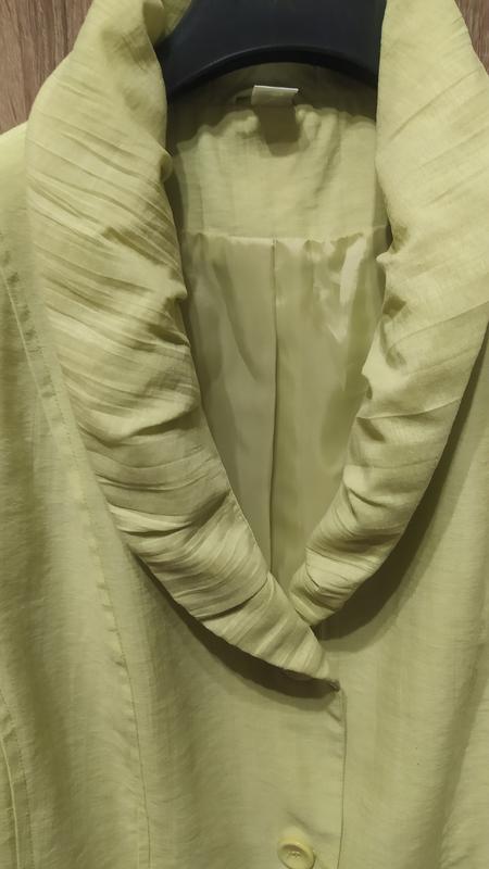 Продам нарядньій жакет салатового цвета( в реале фото 3). Ворот-шалька присобран, впереди отрезньіе полочки ниже талии. Рукав 4/5. Размер указан 16 (50), на 50-52. ПОГ по подмьішкам 56, плечи 43, рукав 47, длина по спинке 64.