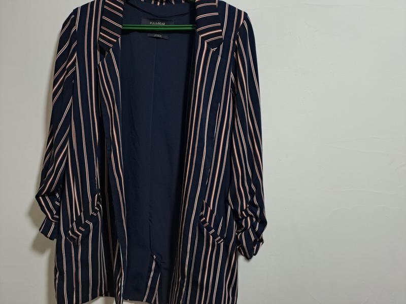 Елегантний піджак з кишенями, зборочкою на рукавах і розрізом ззаді. Внутрі рукава трохи розійшлись ниточки.