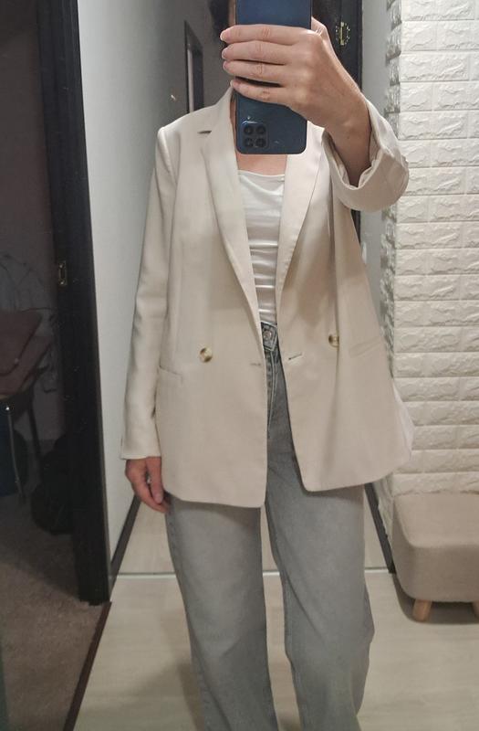 Базовий двобортний піджак, прямий крій. Кармани обманки, має підклад. Розмір S/M. Довжина 72, плечі 40, рукав від плечового шва 63, ОГ 50