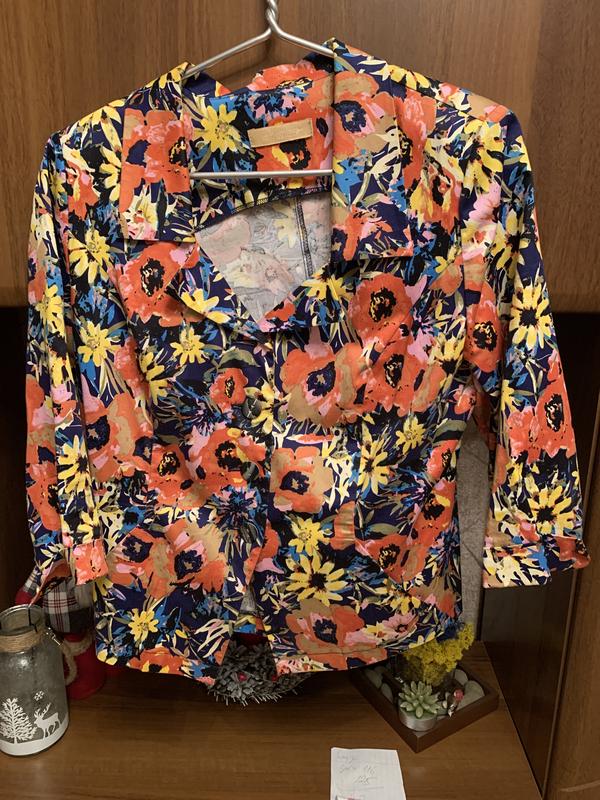 52 р- 54 см, з бавовни, з кишенями, коміром і ґудзиками, рукав три чверті з відворотом. Сідає по фігурі, виглядає дуже жіночно.