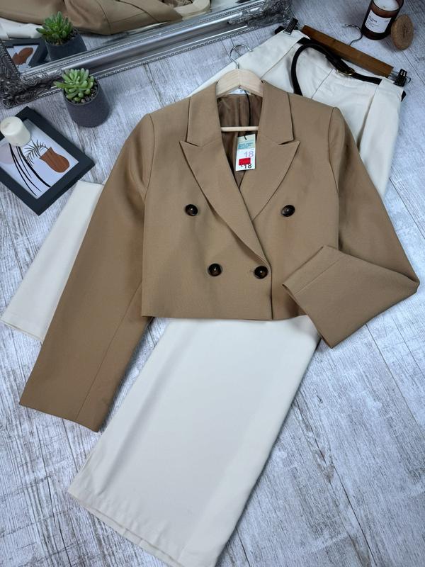 Новий , є бірка Розмір на бірці -18 Довжина -50 Рукава-65 ПОГ-58 Низ-58 Плечі -42 В складі - поліестр віскоза еластан Дефектів немає Стан ідеальний