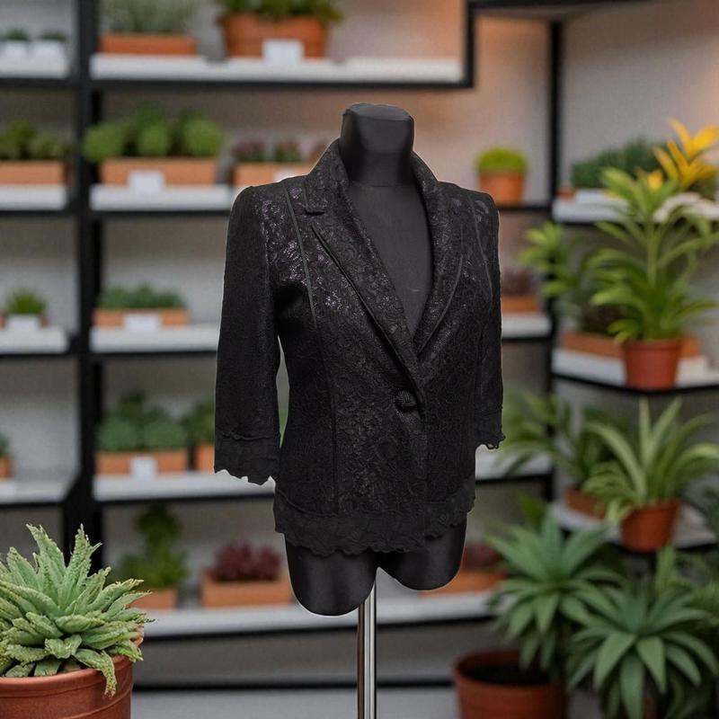 📌 Склад тканини: - 61% віскоза — м'якість і благородний блиск ✨ - 39% поліамід — міцність і еластичність 💪 - Підкладка: 100% поліестер — легкість і комфорт 🌬️ 🎁 Ідеально поєднується з платтями, спідницями та навіть джинсами — універсальний елемент гардероба! Розмір вказаний 10 НОГ 46 см НОТ 45см Довжина 60 см Довжина рукава від плеча 45 см Плечі 38 см