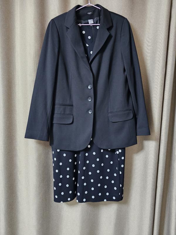 Піджак в ідеальному стані чорного кольору , фото трохи висвітлює колір . По бірці розмір 20 наш 54 але орінтуйтесь по замірам . Заміри : об/груди 120 , об/талія 114 , об/стегна 122 , довжина 73 , рукав 65 , плечі 42 . Тканина : 50% вовна , 48% поліестер , 2% еластан .