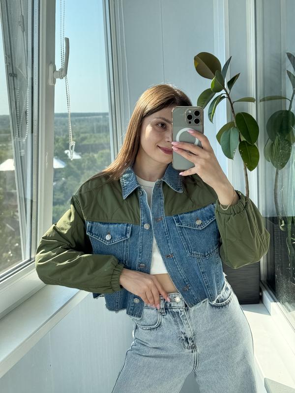 Нова з офіційно сайту ! З біркою ! Вкорочена легка комбінована куртка 💙 без підкладки 💖фірма: Bershka 💖розмір: eur S usa S Mex 26 💖склад: 100% поліестер / 58% поліамід 42% поліестер / денім 100% котон 💖Напівобхват грудей : вільно 51,5 см 💖Напівобхват низу: 49 см 💖довжина : від плечового шва 36,5 см/від горловини 46,5 см/ від пахви 14,5 см 💖плечі спущені : по швам 51 см 💖рукав: від плечового шва 53 см / від горловини 72,5 см/ від пахви по шву 42 см На фото одягнено на параметри: Обʼєм грудей 90 см;Обʼєм талії 72 см; Обʼєм стегон 95 см. Зріст 1,66 м( зазвичай ношу розмір S/М)