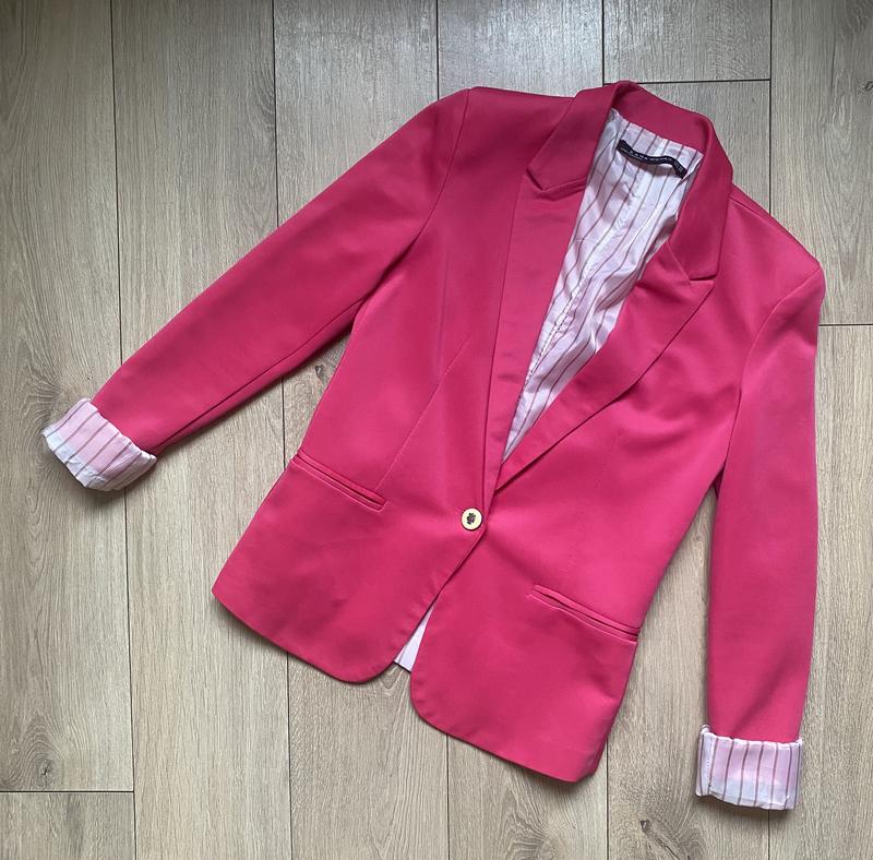 Рожевий піджак розмір XS в дуже хорошому стані. Є затяжка і нюанси по підкладці (все є на фото). Виробник: фабричний Китай. Заміри: довжина ПОГ рукав від плеча.