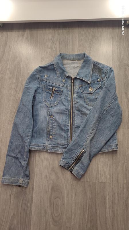 Жіноча джинсовка синього кольору стан задовільний, є дефекти ззаду облущилася екошкіра там де біла шнурівка, але воно майже непомітно що там було екошкіра і на воротнику є полоса фото додаю