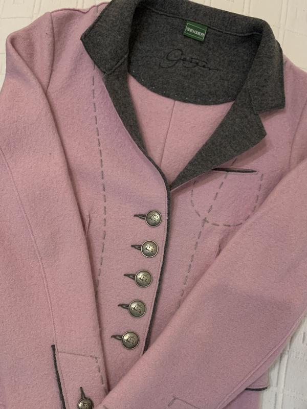 Піджак в чудовому поєднанні кольорів- ніжно рожевий і сірий, тонка шерсть, стан нового, якість неймовірна, на р. S Заміри - плечі 39, груди 45, талія 38; довжина 60, довжина рукава 60.